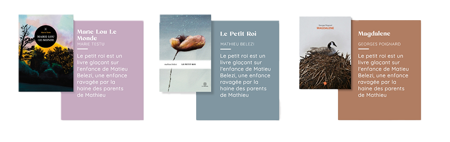 Each book is introduced through a colored block containing the book title and key information. Positioned right next to it is a smaller book cover image, allowing users to visually recognize the book without overwhelming the interface with large image files.